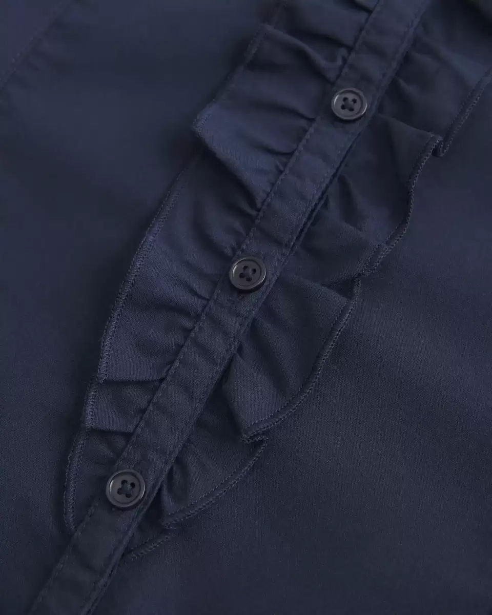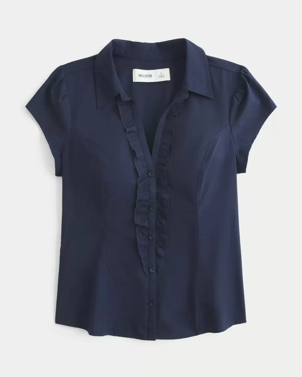 A soft, classic tuxedo-style short-sleeve shirt with ruffles along the front button closure. Collar, seam details for a tailored look. Slim Fit. Imported.