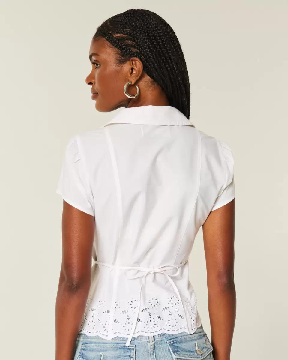 This soft, boho-inspired short-sleeve shirt features eyelet-embroidery along the hem. Collar, stretch poplin fabric. Slim Fit. Imported.