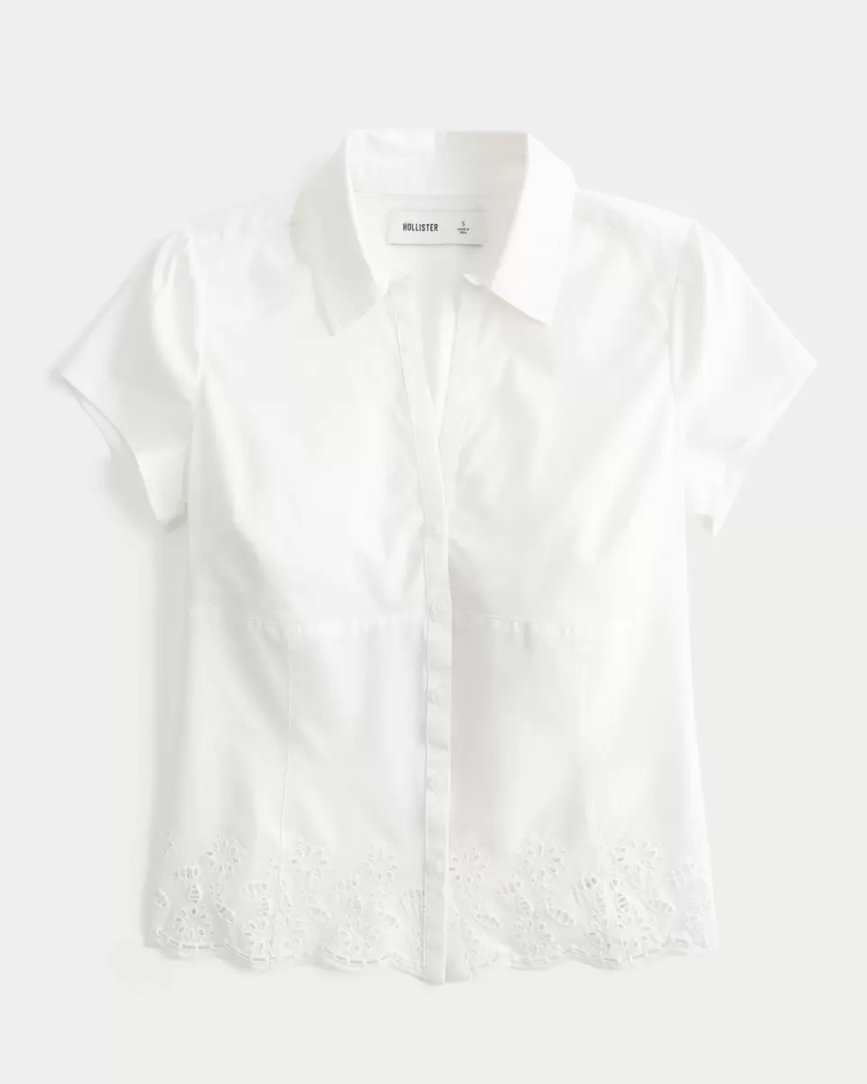 This soft, boho-inspired short-sleeve shirt features eyelet-embroidery along the hem. Collar, stretch poplin fabric. Slim Fit.