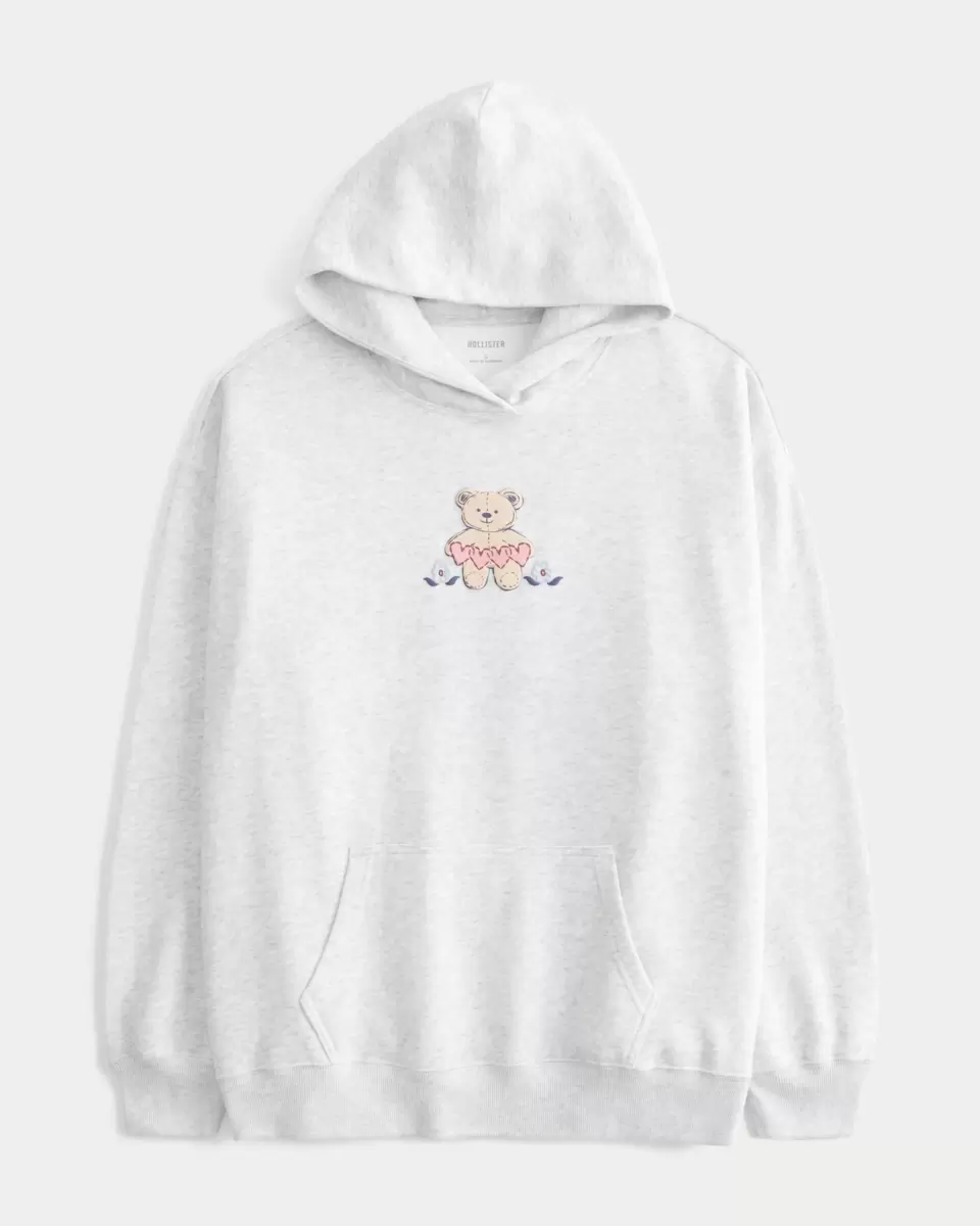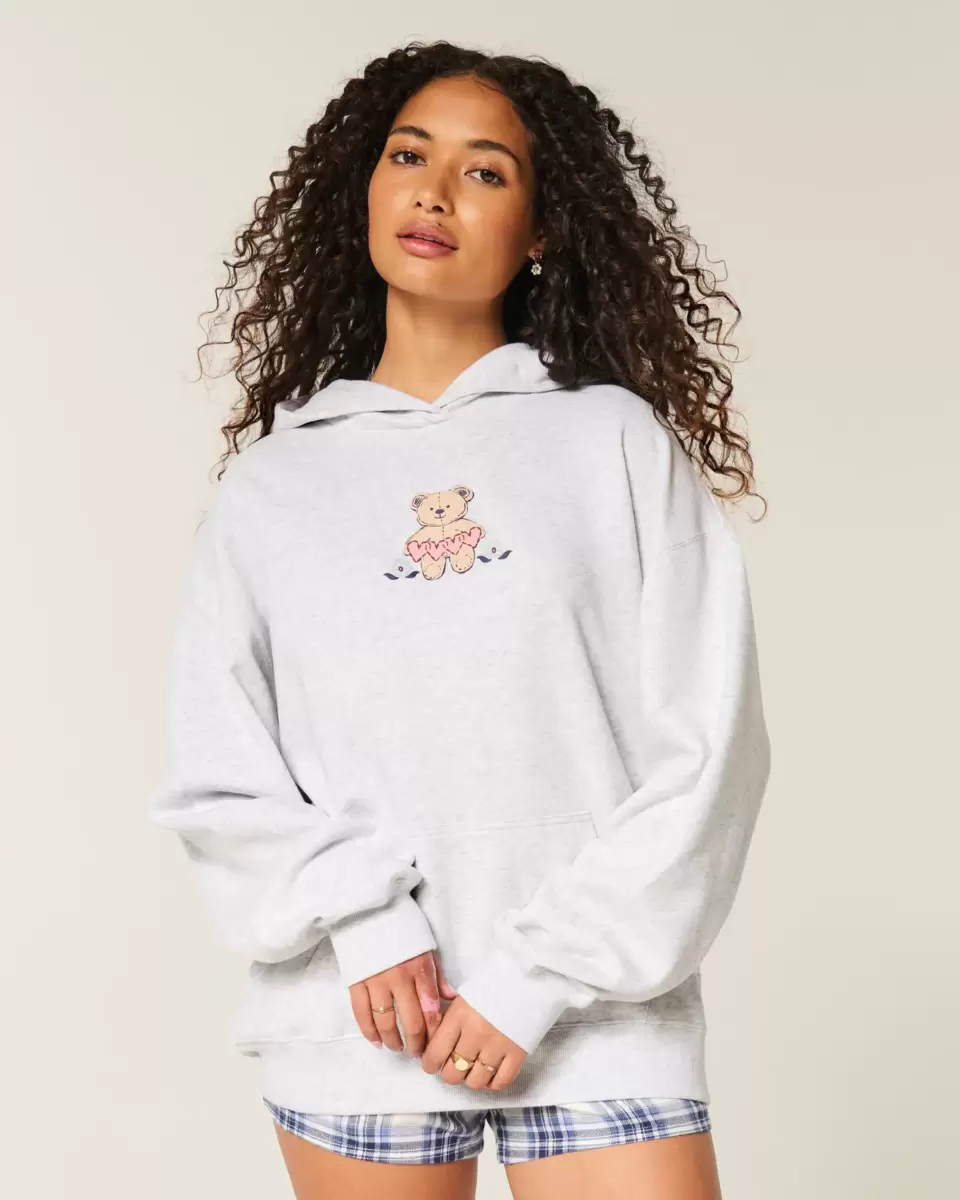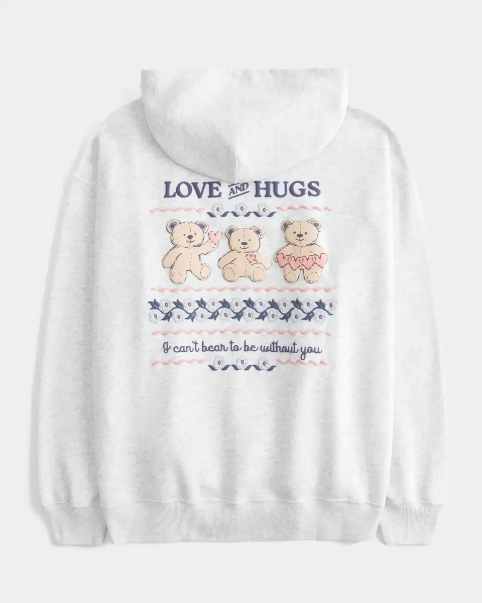 A super soft fleece hoodie featuring teddy bear graphics at the front and back. Hood, front pouch pocket, long sleeves. Imported.
