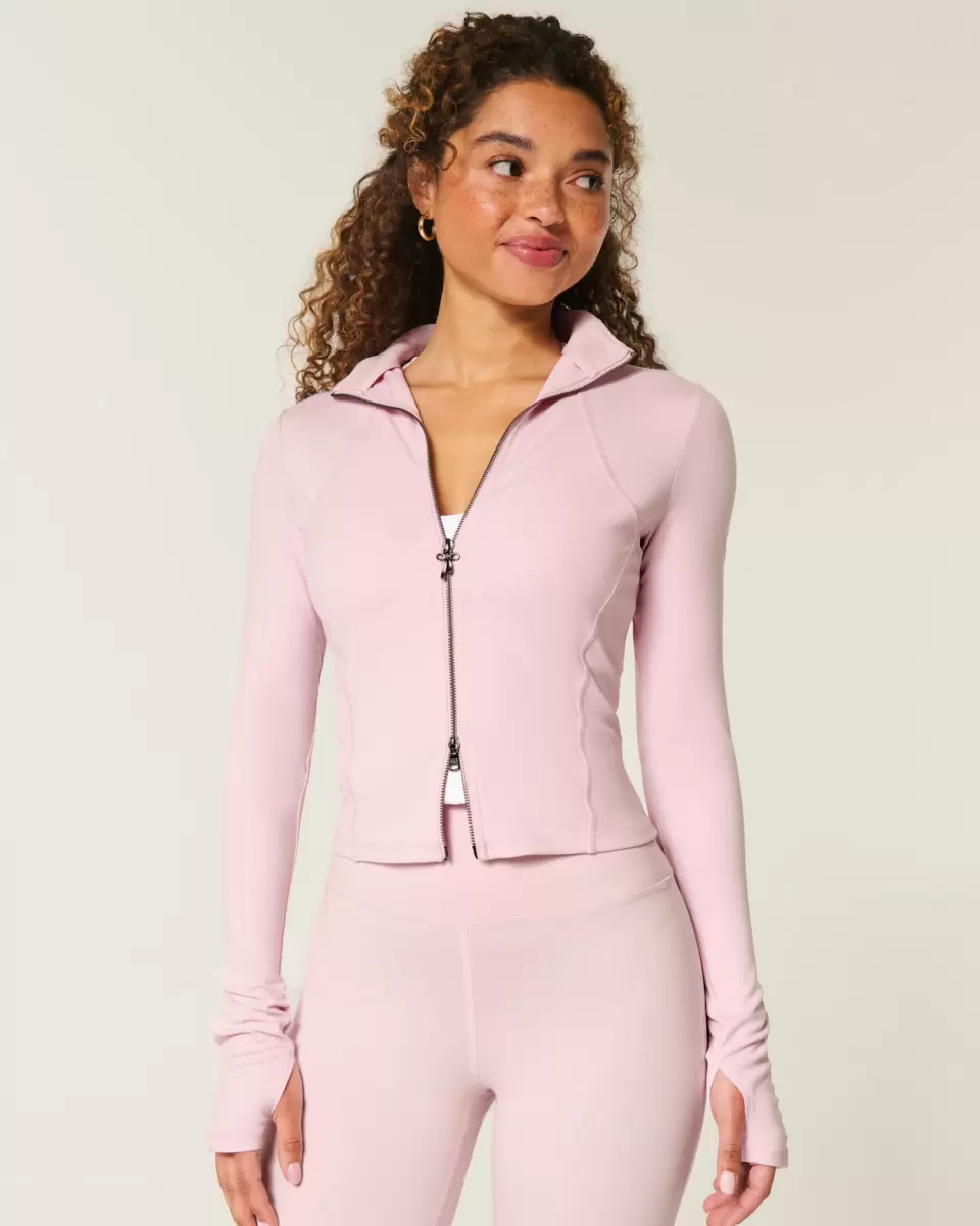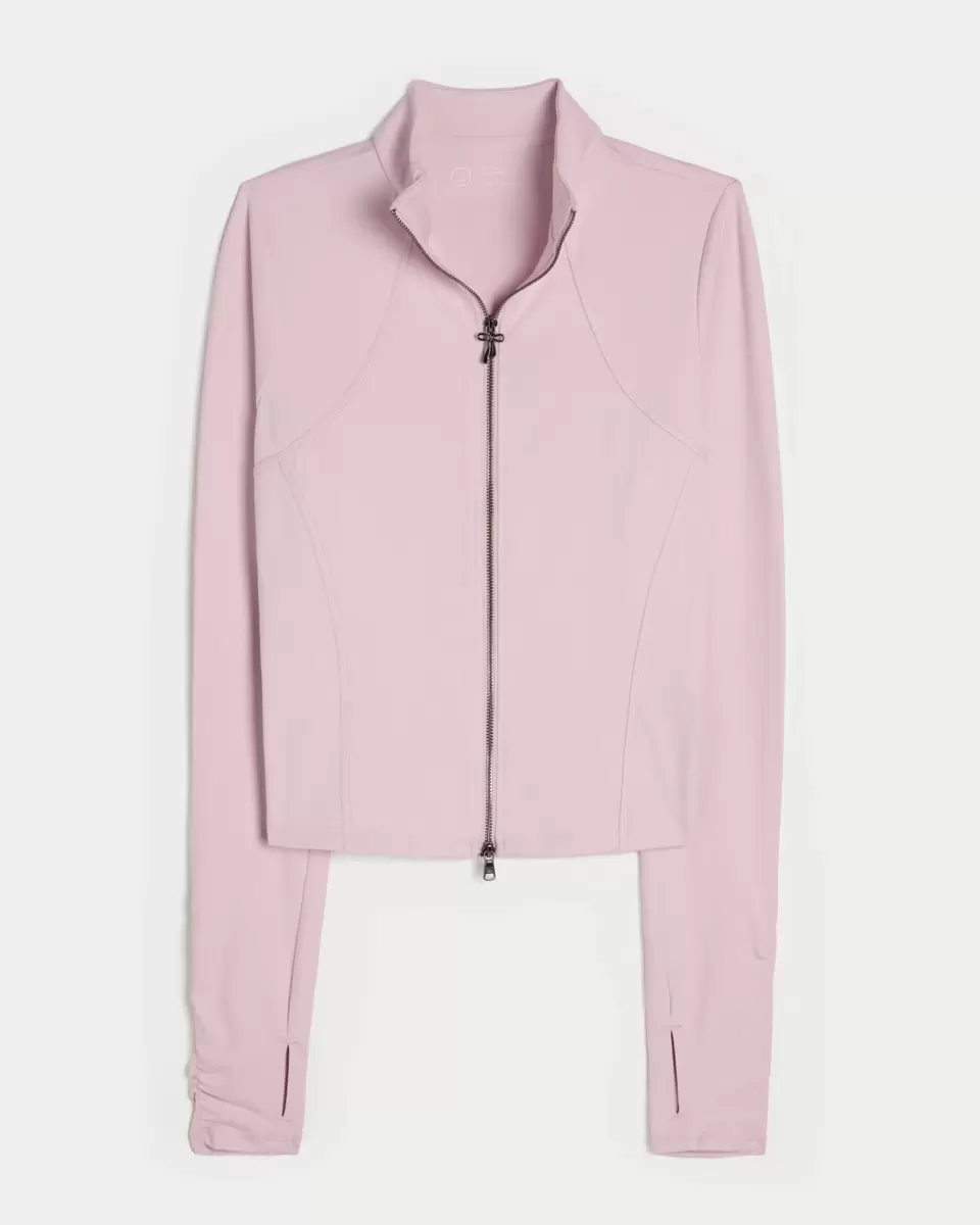 Designed in our breathable, 4-way stretch, moisture-wicking Recharge fabric with a super soft, brushed feel. Double zipper closure with bow detail, front pockets, long sleeves with ruched details and thumb openings. Imported.