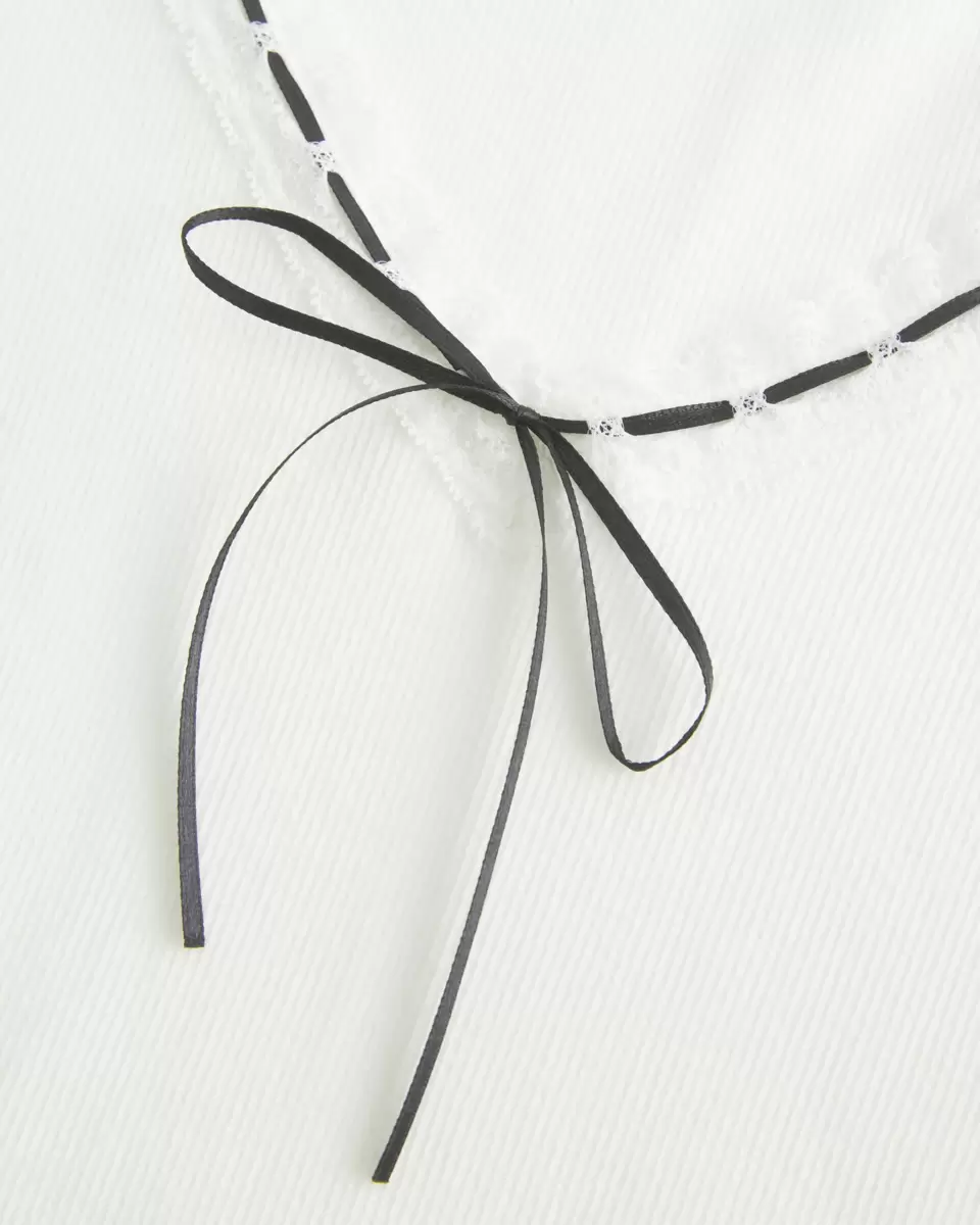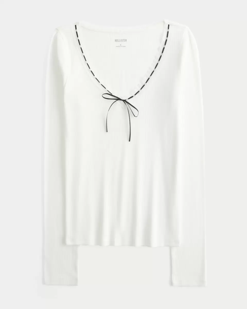 Super soft and comfy, this top features pretty lace trim along the neckline with an interwoven tie detail. Long sleeves. Imported.