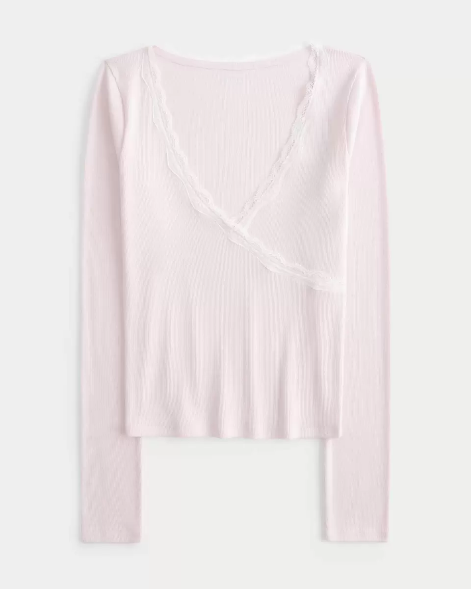 A super soft long-sleeve top featuring a wrap-style v-neckline with pretty lace trim. Slim Fit. Imported.
