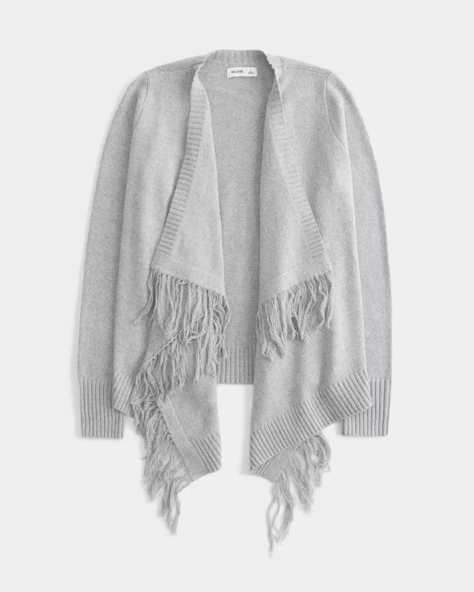 A pretty and super soft cardigan featuring a drapey collar with fringe detailing. No closure, ribbed trims, long sleeves. Easy Fit. Imported.