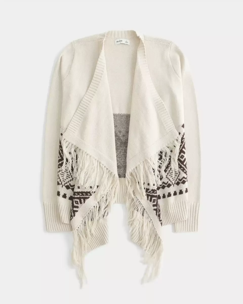 A pretty and super soft cardigan featuring a drapey collar with fringe detailing. No closure, ribbed trims, long sleeves. Easy Fit. Imported.