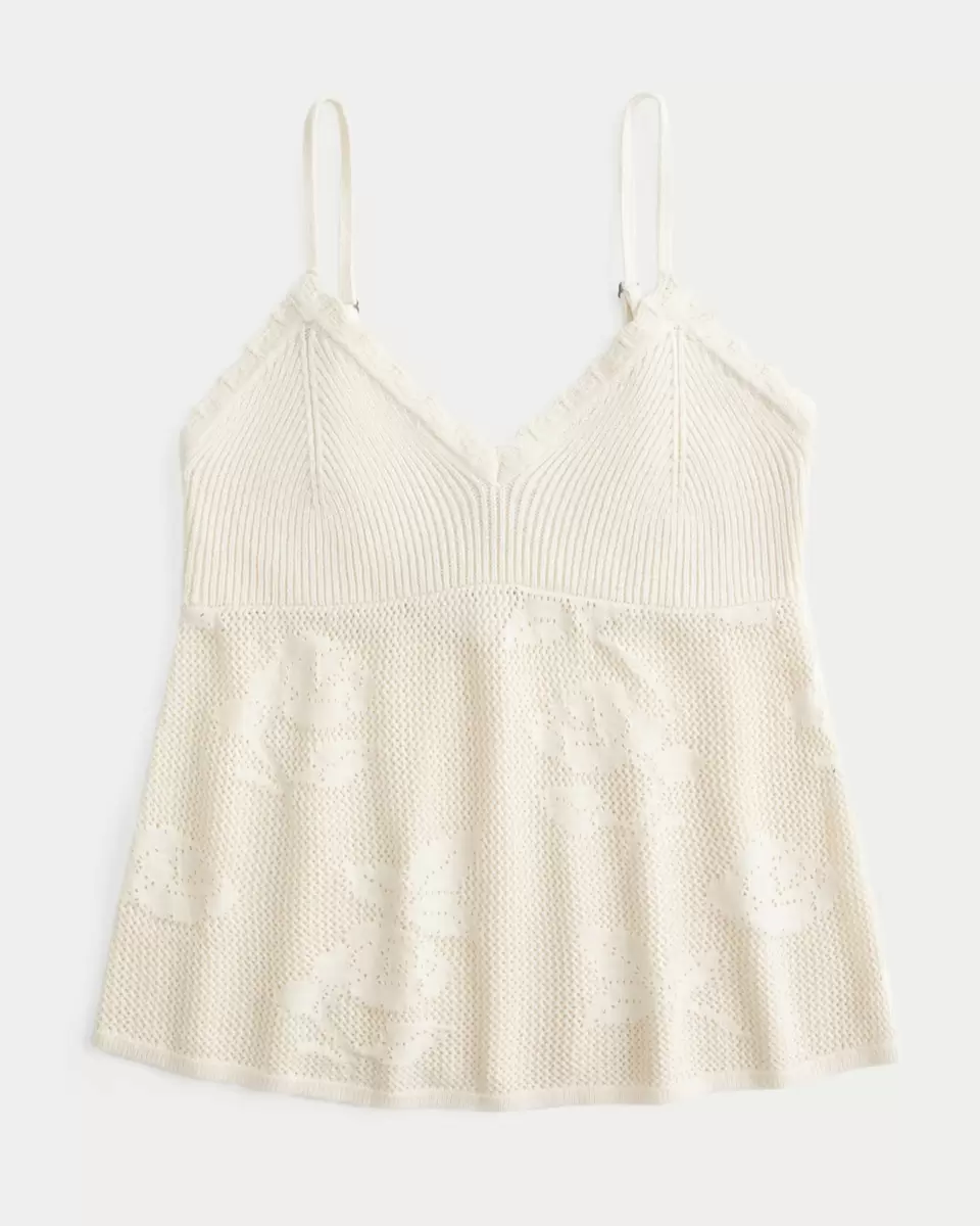 Flowy and super soft, this cami features needlepoint-style stitchy detailing and adjustable straps. Cute babydoll silhouette. Easy Fit. Imported.
