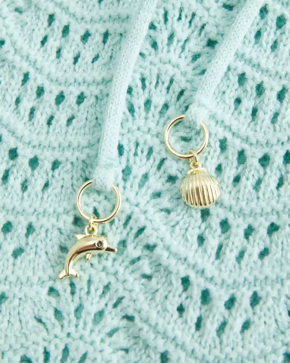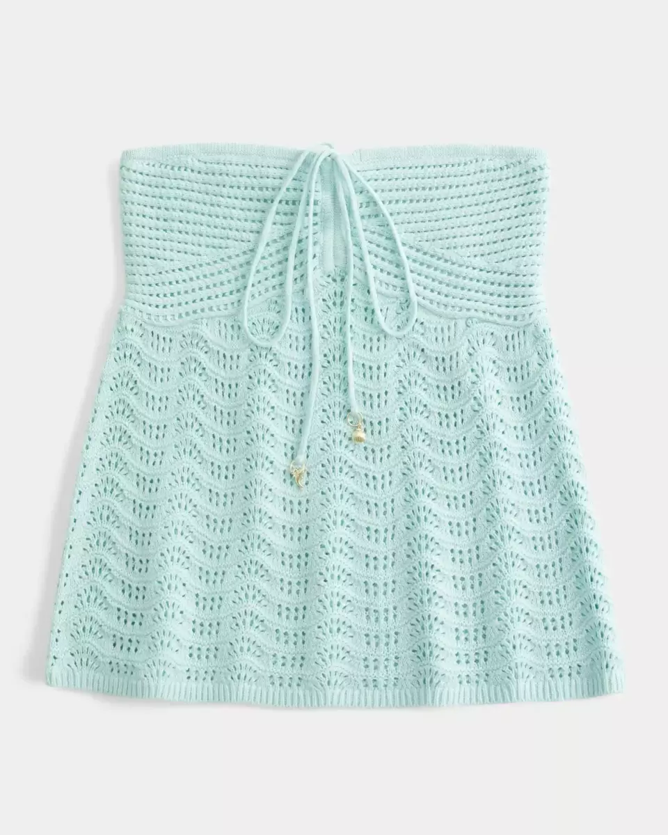 Cute and super soft, this strapless top is made with cozy crochet-style fabric and features a front tie with charm details. Can be worn as a halter top! Easy Fit. Imported.