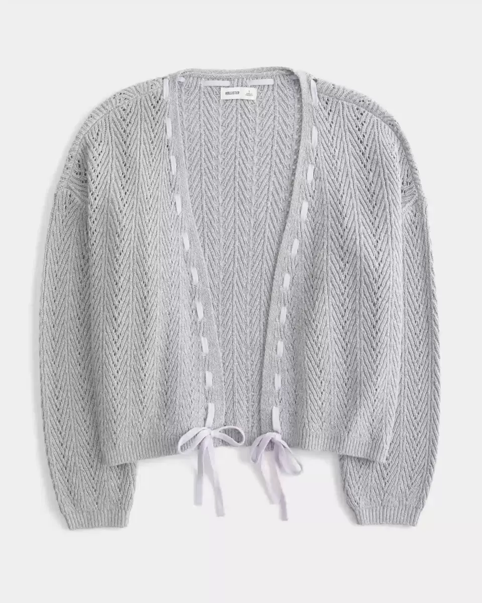 This super soft cardigan features a pretty tie detail along the neckline. No closure, classic textured stitch, ribbed hems, long sleeves. Easy Fit. Imported.