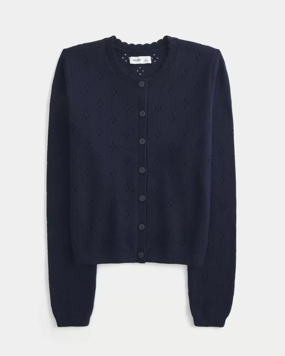A cozy and super soft cardigan with pretty all-over eyelett patterns and a scalloped crew neckline. Full button closure, ribbed trims, long sleeves. Imported.