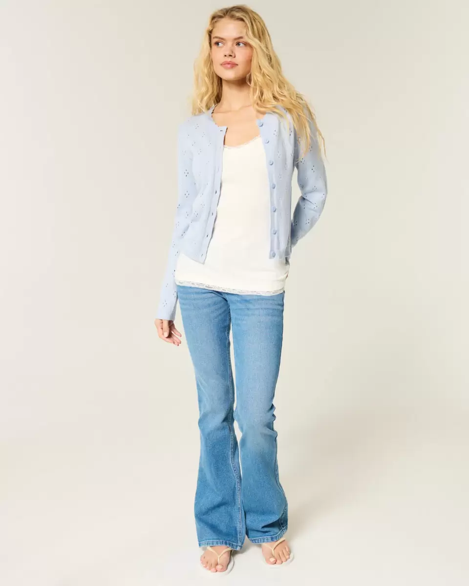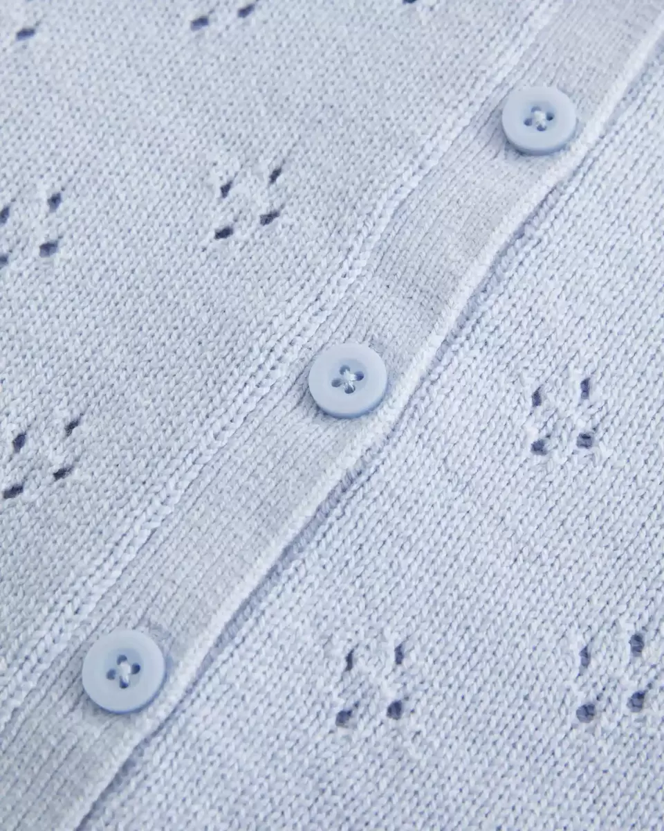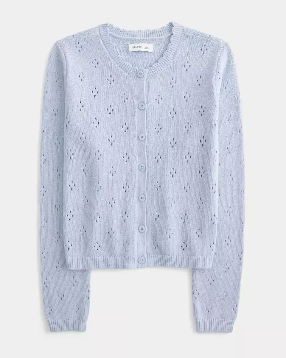 A cozy and super soft cardigan with pretty all-over eyelett patterns and a scalloped crew neckline. Full button closure, ribbed trims, long sleeves. Imported.
