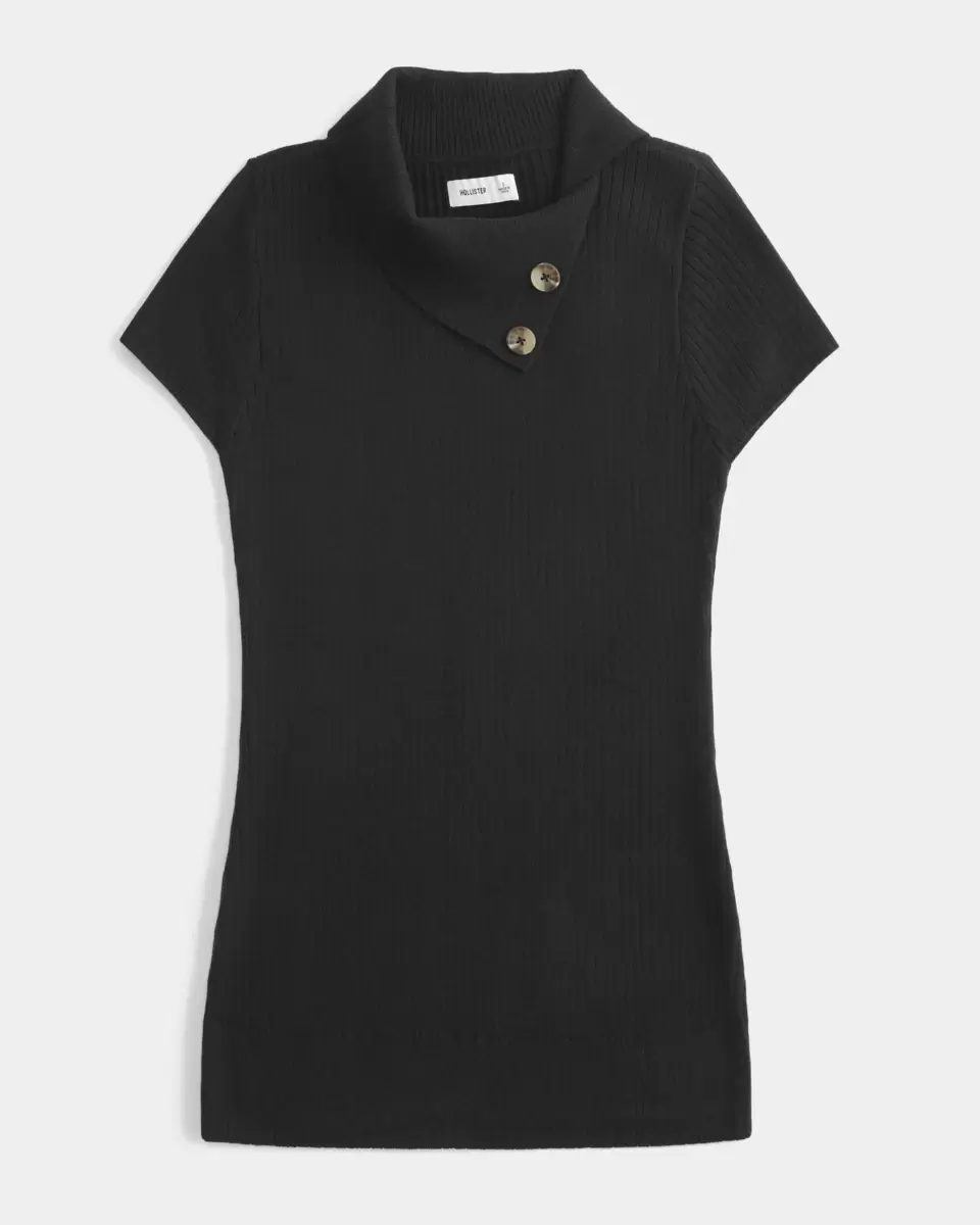 This super soft tunic sweater features a classic asymmetrical collar with buttons and short sleeves. Longer length. Slim Fit. Imported.