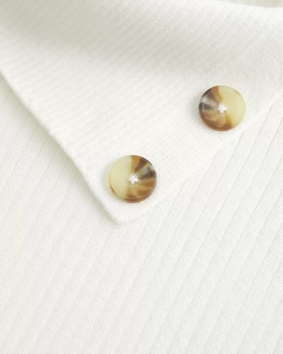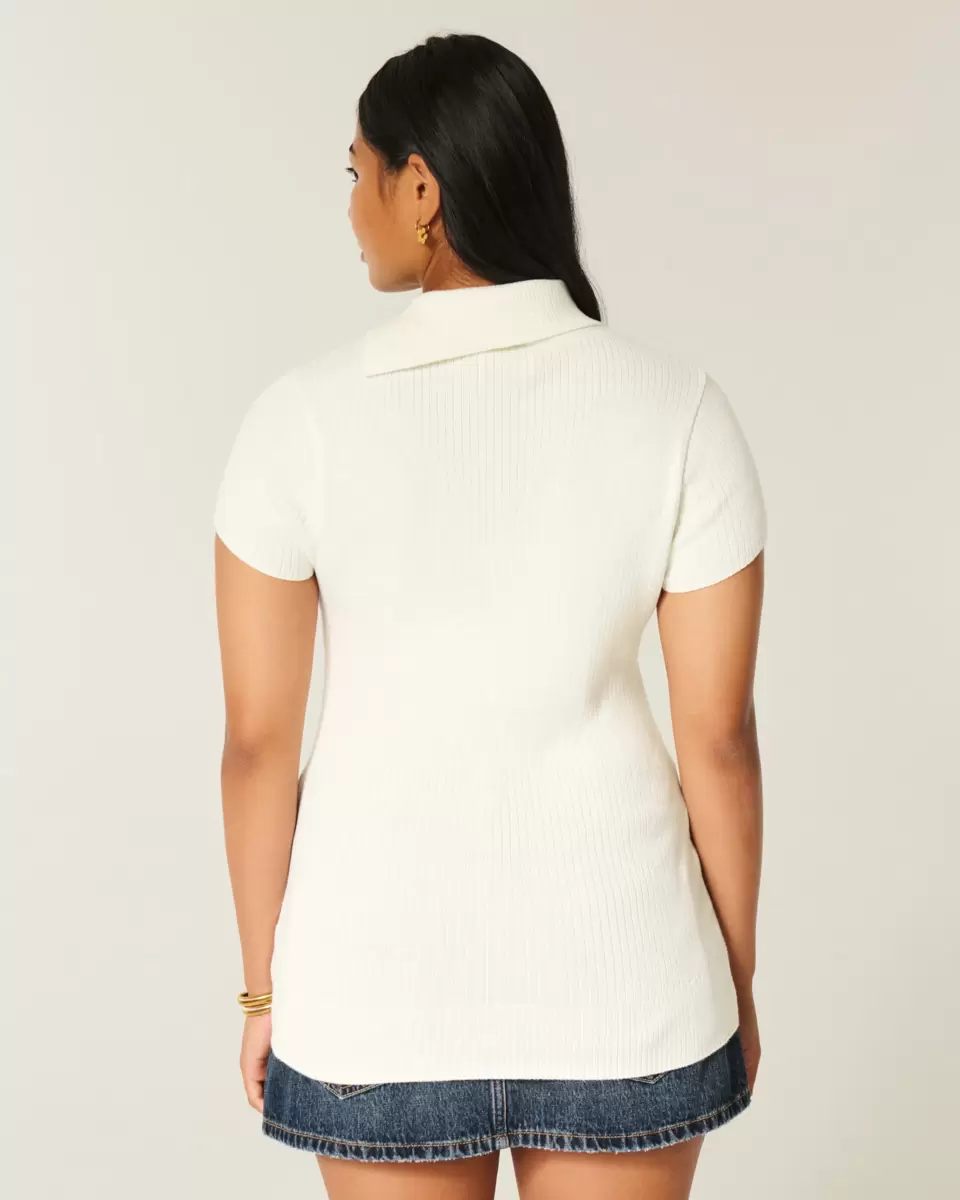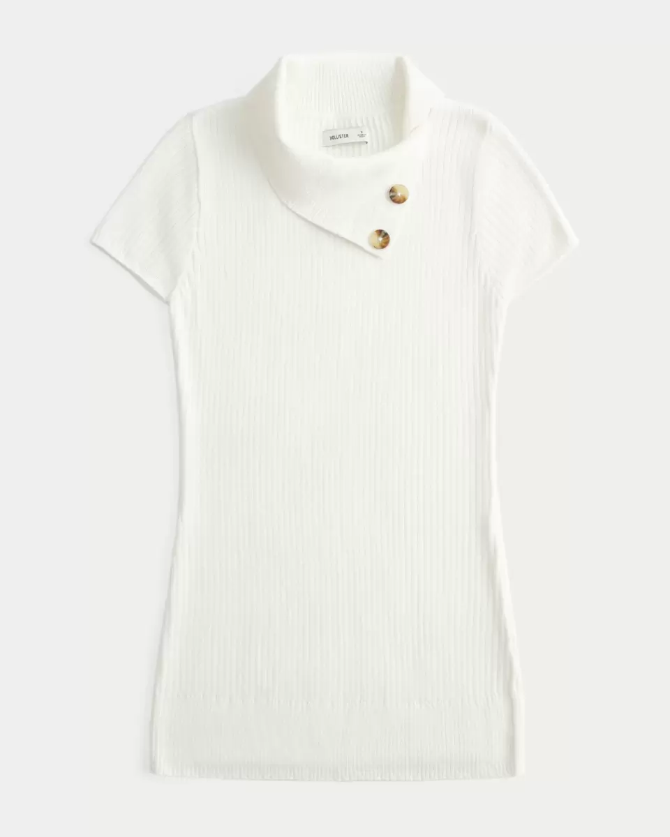 This super soft tunic sweater features a classic asymmetrical collar with buttons and short sleeves. Longer length. Slim Fit. Imported.