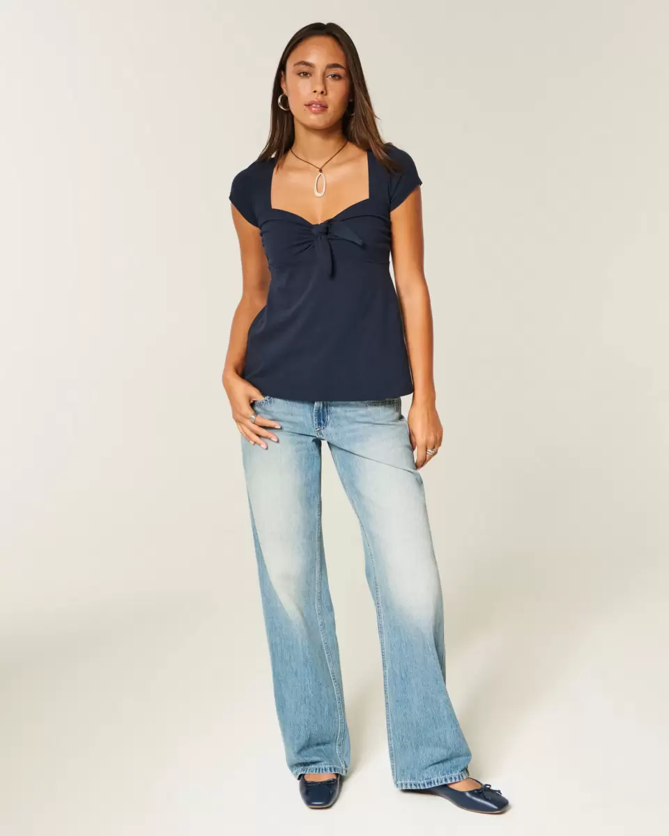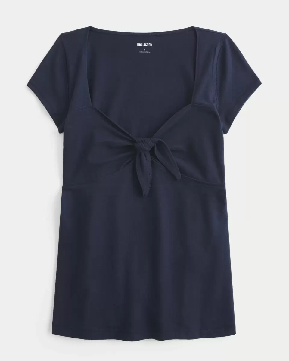 A flowy and super soft babydoll top featuring a cute tie detail at the bust. Short sleeves, longer length. Easy Fit. Imported.