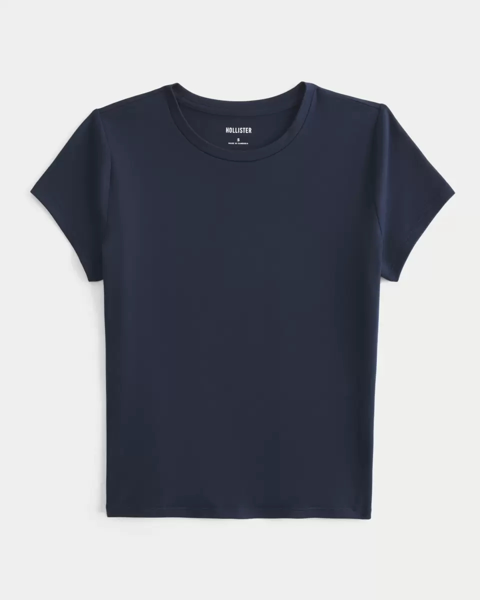 Cute and comfy, this baby tee is made with soft stretch fabric with a seamless look and feel. Crew neckline, short sleeves. Slim Fit.